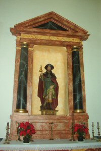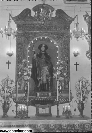 Inicialmente el altar de S. Roque era sólo un nicho cavado en la pared. Luego se hizo el altar que se muestra en la foto de la izquierda. A principios de los años 70 se cambió por el de la foto pequeña que es el actual. El altar de S. Roque y el de S. José junto con el actual Altar Mayor constituían el tabernáculo de estilo neoclásico hecho por Francisco Villanueva en 1809. |